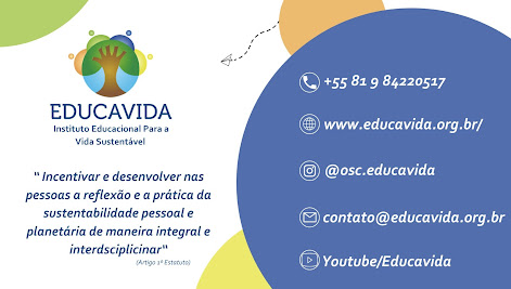 O Educavida tem como missão; educação para a sustentabilidade pessoal e planetária. Que significa sustentabilidade emocional, financeira, mental, e tudo o mais que o ser humano precisa! E vocês poderão acompanhar essa missão em outras redes sociais, como: nosso site, canais Instagram e Facebook do Educavida, Youtube. Que são onde disponibilizamos mais regularmente conteúdos preciosos.